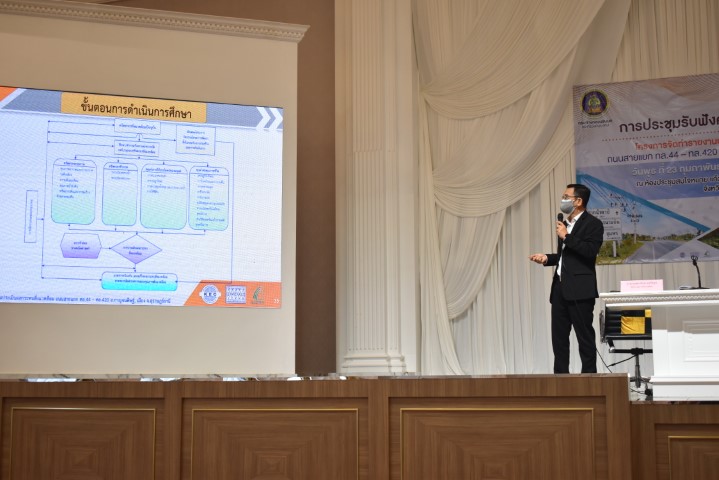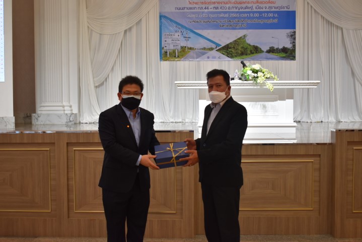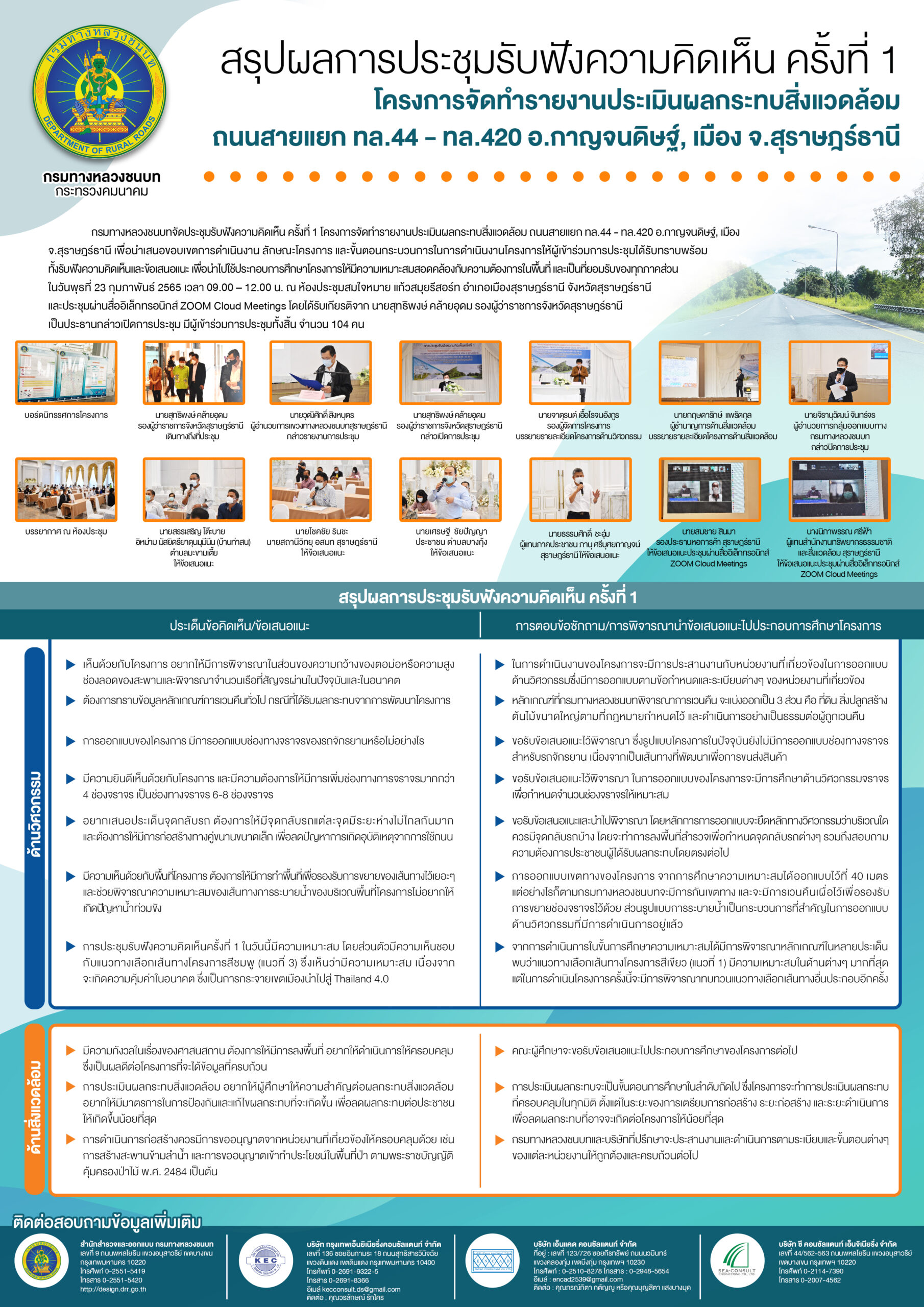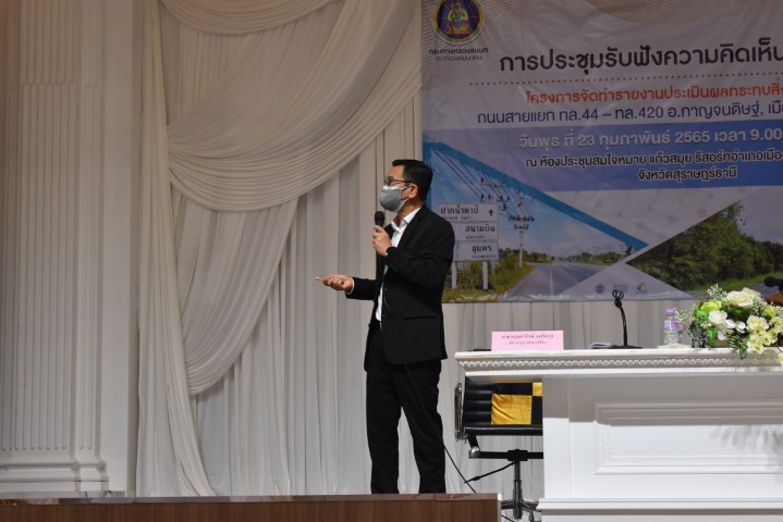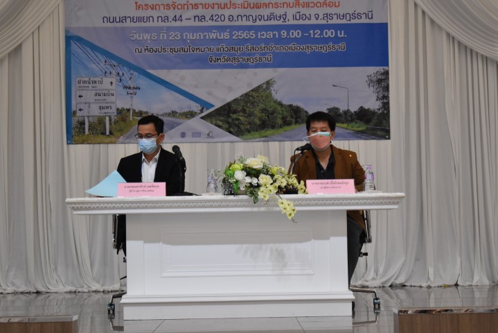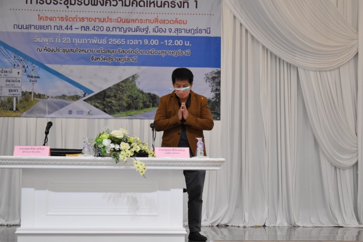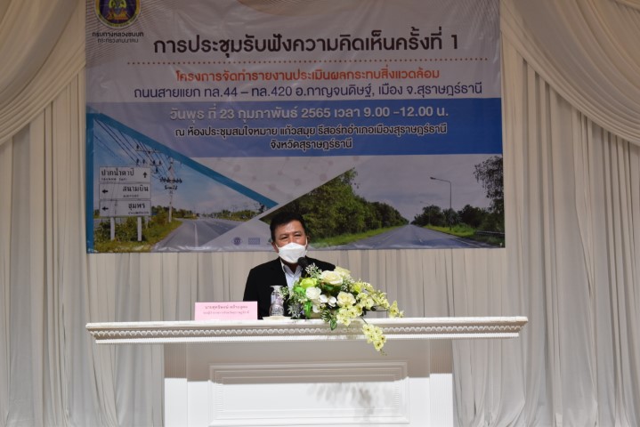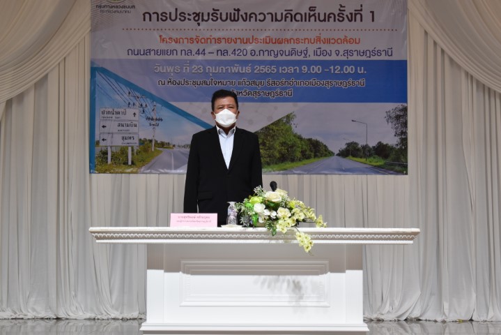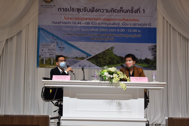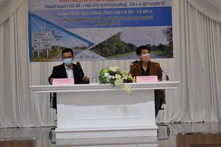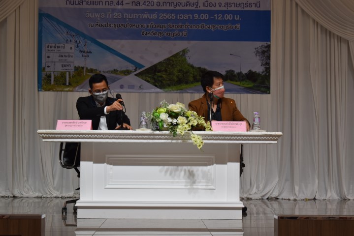 วันพุธที่ 23 กุมภาพันธ์ 2565 เวลา 9.00-12.00 น. นายสุทธิพงษ์ คล้ายอุดม รองผู้ว่าราชการจังหวัดสุราษฎร์ธานี เป็นประธานกล่าวเปิดการประชุมรับฟังความคิดเห็น ครั้งที่ 1 โดยมี นายวุฒิศักดิ์ สิงหบุตร ผู้อำนวยการแขวงทางหลวงชนบทสุราษฎร์ธานี เป็นผู้กล่าวรายงาน พร้อมนายจิรานุวัฒน์ จันทร์จร ผู้อำนวยการกลุ่มออกแบบทาง กรมทางหลวงชนบท ร่วมชี้แจงรายละเอียดโครงการ ณ ห้องประชุมสมใจหมาย แก้วสมุยรีสอร์ท อำเภอเมืองสุราษฎร์ธานี จังหวัดสุราษฎร์ธานี ในการประชุมดังกล่าวมีผู้เข้าร่วมประชุม 104 คน ผู้เข้าร่วมประชุมส่วนใหญ่เห็นด้วยและยินดีให้การสนับสนุนโครงการ